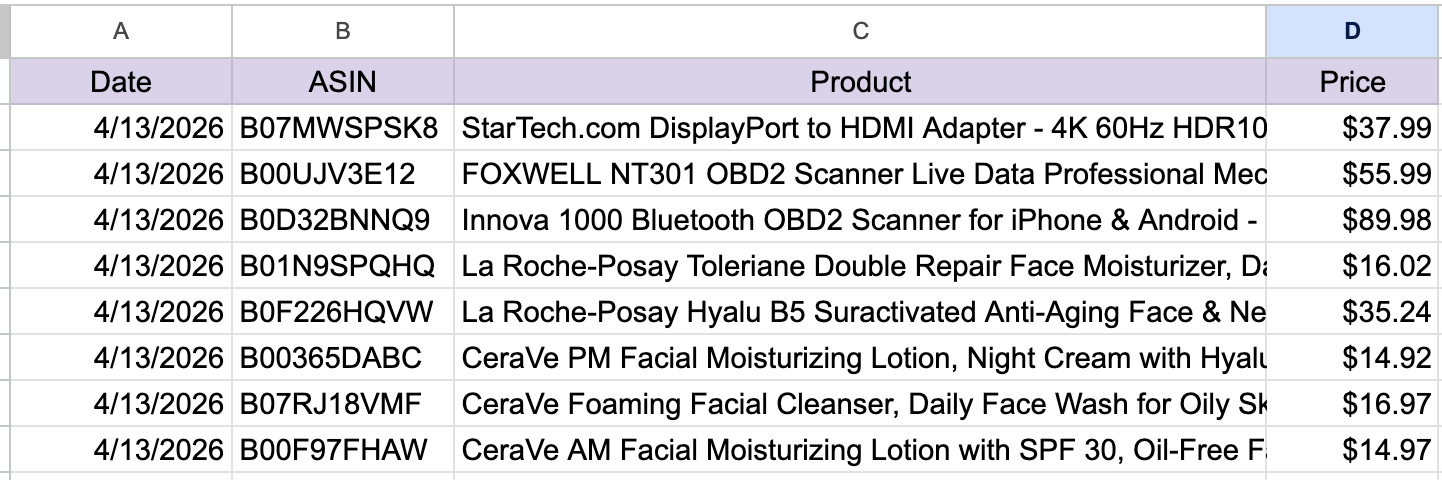 But here's the thing. I wasn't using 90% of it. What I actually needed was simple: check a list of competitor ASINs every day, grab the current price and title, and log the running list to a spreadsheet so I can spot changes.