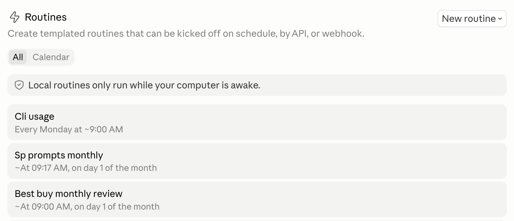 There's a "local routines" option too (you may have seen the "Local routines only run while your computer is awake" note in the UI). But the headline feature is cloud, and that's where the real power lives.