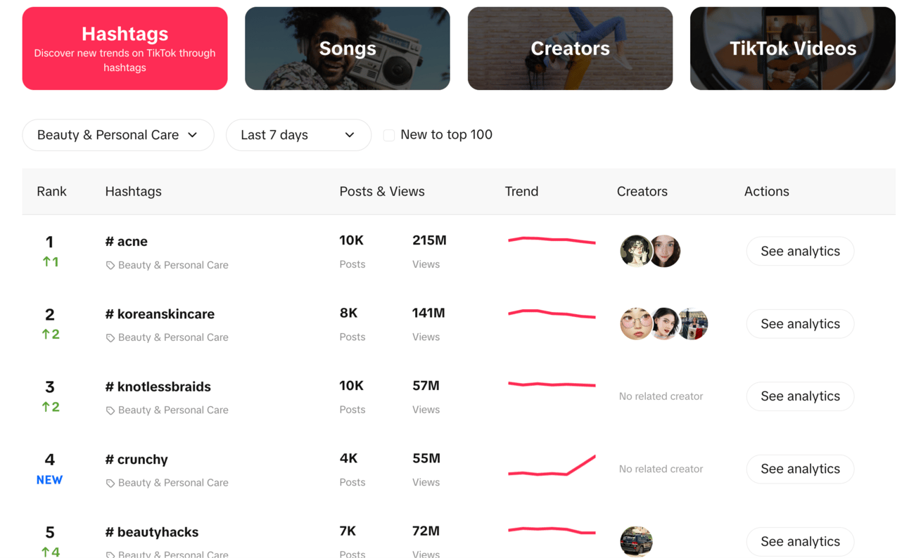 To access specific trends, choose a category, such as Beauty & Personal care and pick your time window (7d, 30d, 120d). You can now see the top trending hashtags, the trend line, the top creators, and detailed analytics for each where you can analyze the actual videos themselves.