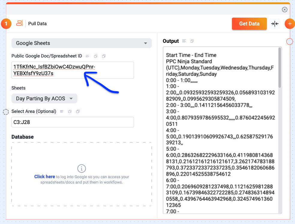 I provided the Google sheets ID as input. This can be extracted from your Sheet’s URL: https://docs.google.com/spreadsheets/d/1TfiKfrNc_IsfBZbiOwC4DzwuQPnr-YEBXfsfY9zU37s/edit?gid=765579313#gid=765579313