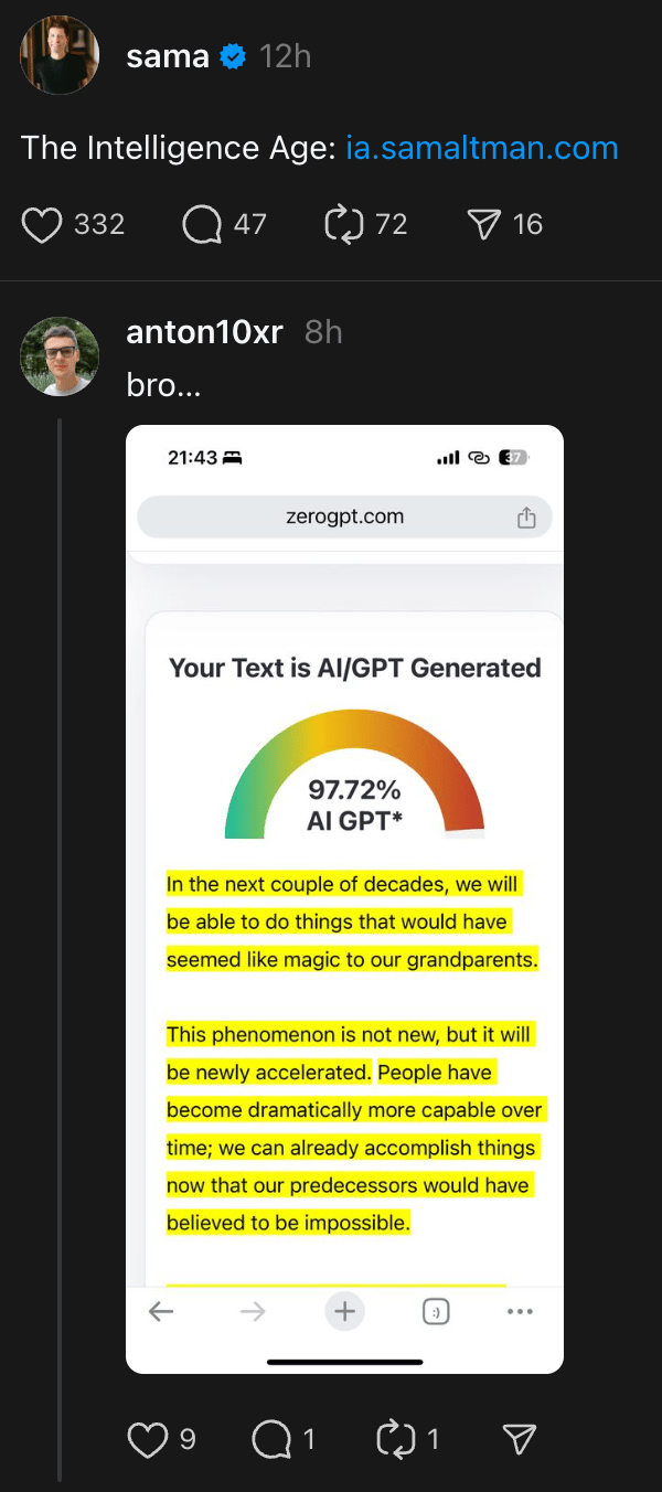 On closer inspection, the post seems to be written entirely by AI (perhaps by the soon-to-be announced ChatGPT5?), so seamless that most wouldn’t notice.