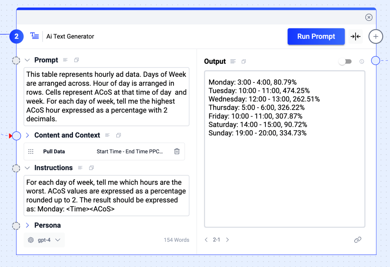 For step 2, I asked it to generate for each day of the week, the worst hours of day in terms of ACoS. To achieve this, I used their Text → AI Text Generator module where you can create a prompt and choose from a bunch of LLMs (like GPT4, GPT4o, Claude, Anthropic, Groq etc). Looks like this: