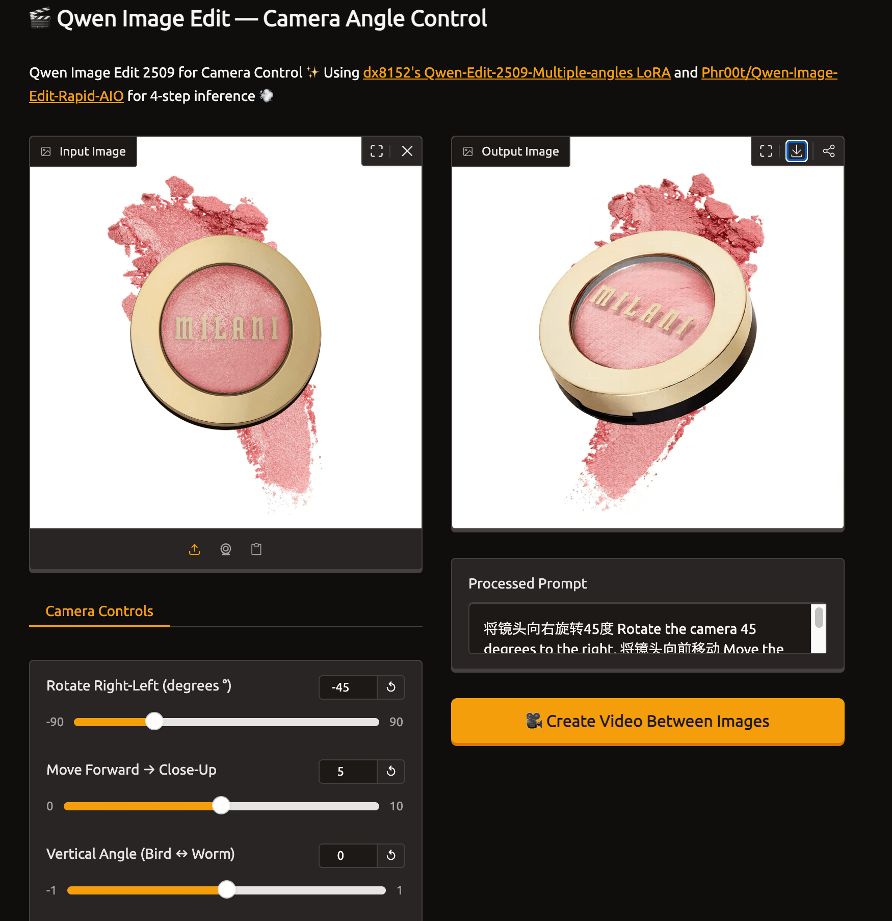 Drop your image into the Hugging Face Qwen Image Edit tool. The magic here is the sliders. You can rotate the product by precise degrees, move closer in controlled steps, or shift the bird to worm angle without guessing. This gives you a clean pair of frames that feel like they came from a planned shoot.