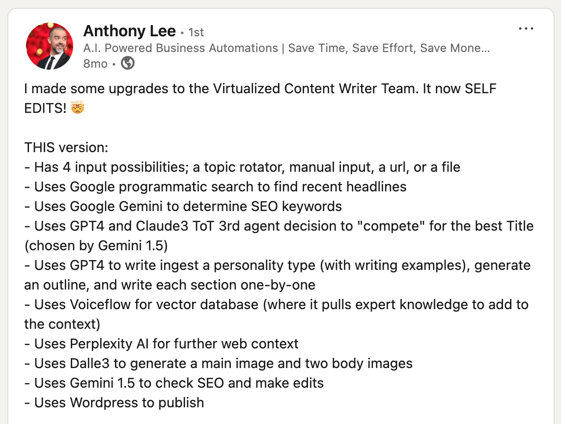 This guy is miles ahead! Anthony Lee has been knocking it out of the park with advanced AI automation that is both geeky and sophisticated. If you have any geek blood in you, check out this post.