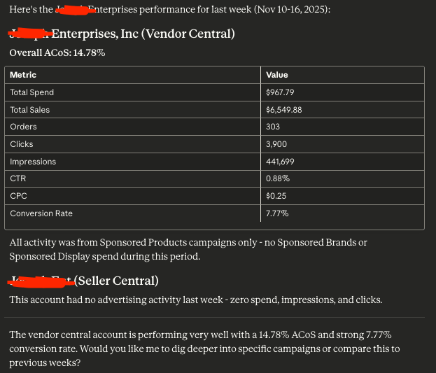 The fun part is what happens after the MCP server is actually connected. You stop βrunning SQL queriesβ and start chatting with your data. Simple things like asking what the average is across all clients at my agency. Or the harder stuff like why did my TACoS go up last month and letting the model dig through multiple tables and assemble the answer on its own.