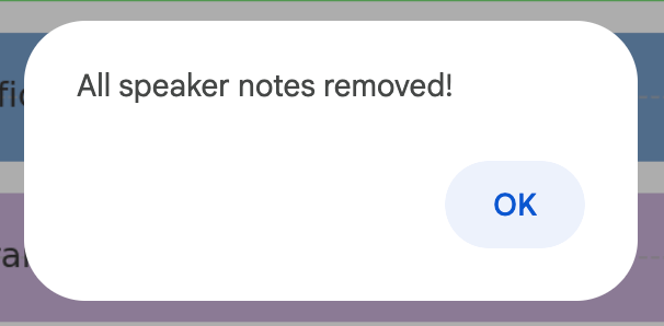 SlidesApp.getUi().alert('All speaker notes removed');