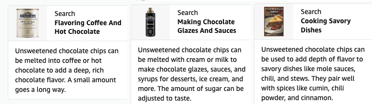 I repeated my search using the original prompt: “What are common unsweetened chocolate chip uses” and received a completely different response. This demonstrates that RUFUS is capable of generating non-monotonous, creative alternatives.