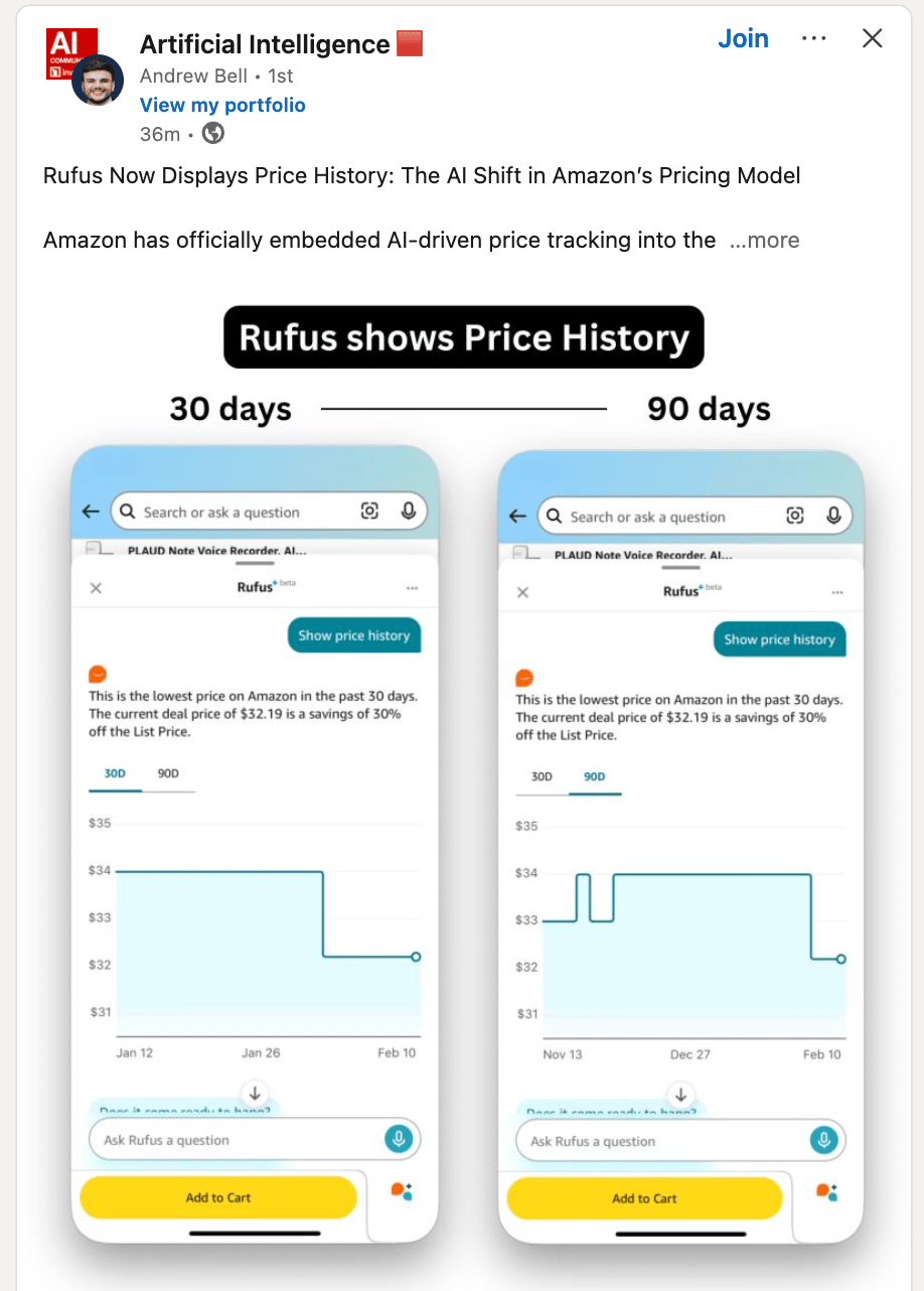 Andrew Bell has been on fire with his RUFUS-related discoveries, and this one is no exception. This time, RUFUS isn’t just surfacing Sponsored Brand ads—it’s also displaying price history.