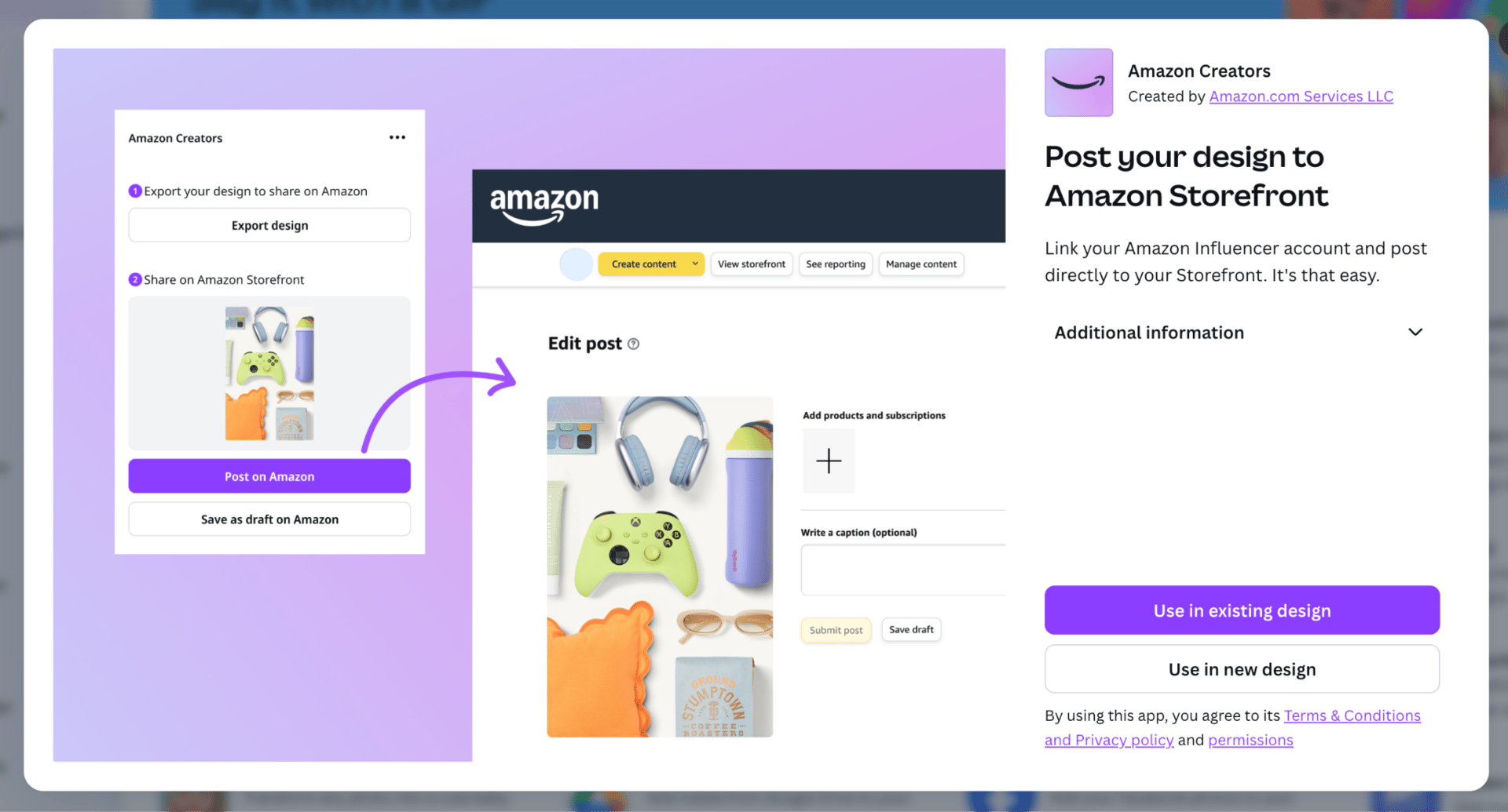 There’s also a second app for Amazon Creators. It lets you post Canva designs directly to your Amazon Storefront. Great for influencer content, collection updates, or promo visuals.