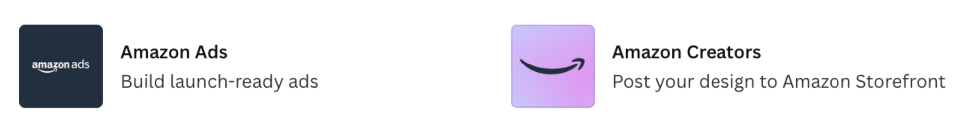 There are 2 new Amazon apps inside Canva and they make building creatives surprisingly smooth. To access these, head over the the Apps section of Canva and search for ‘Amazon’. You’ll see these 2 choices.