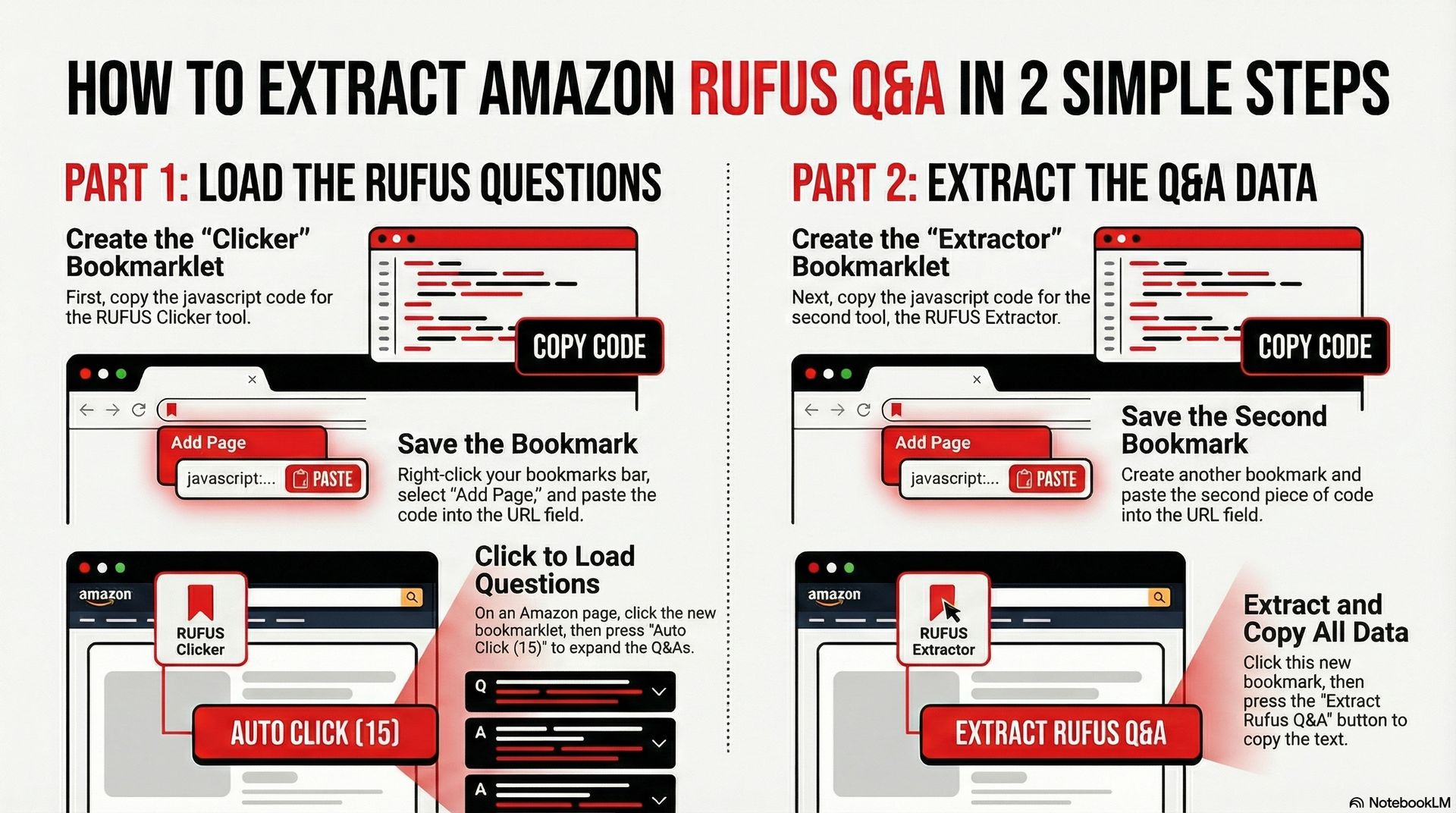 It walked through two separate JavaScript bookmarklets, how to turn them into browser bookmarks, what each one does, and the exact sequence for expanding RUFUS questions, scraping Q and A, and grabbing everything to your clipboard.